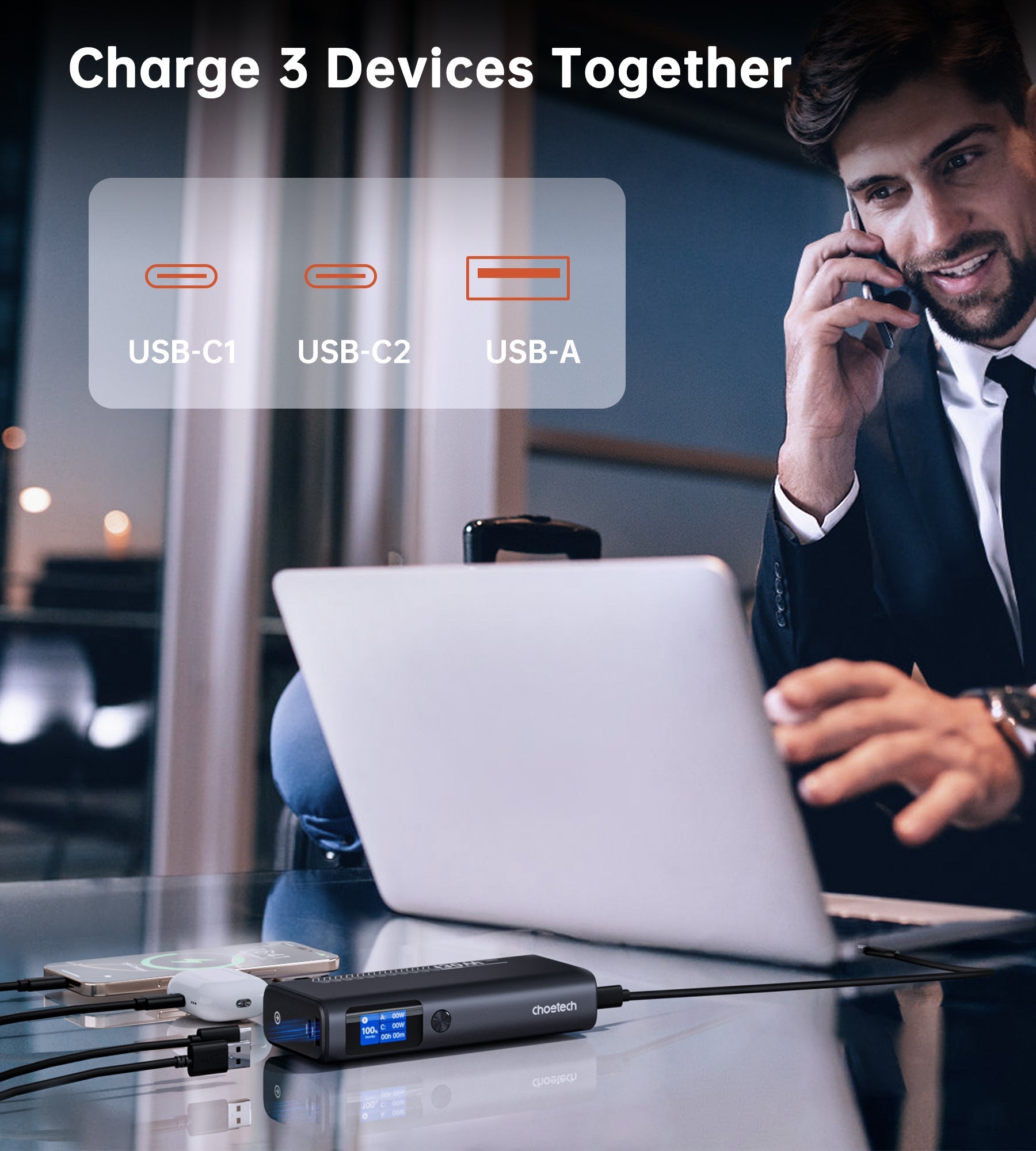 (USB-C1 + USB-C2) + USB-A: 5V⎓4A + 30W (50W Max)