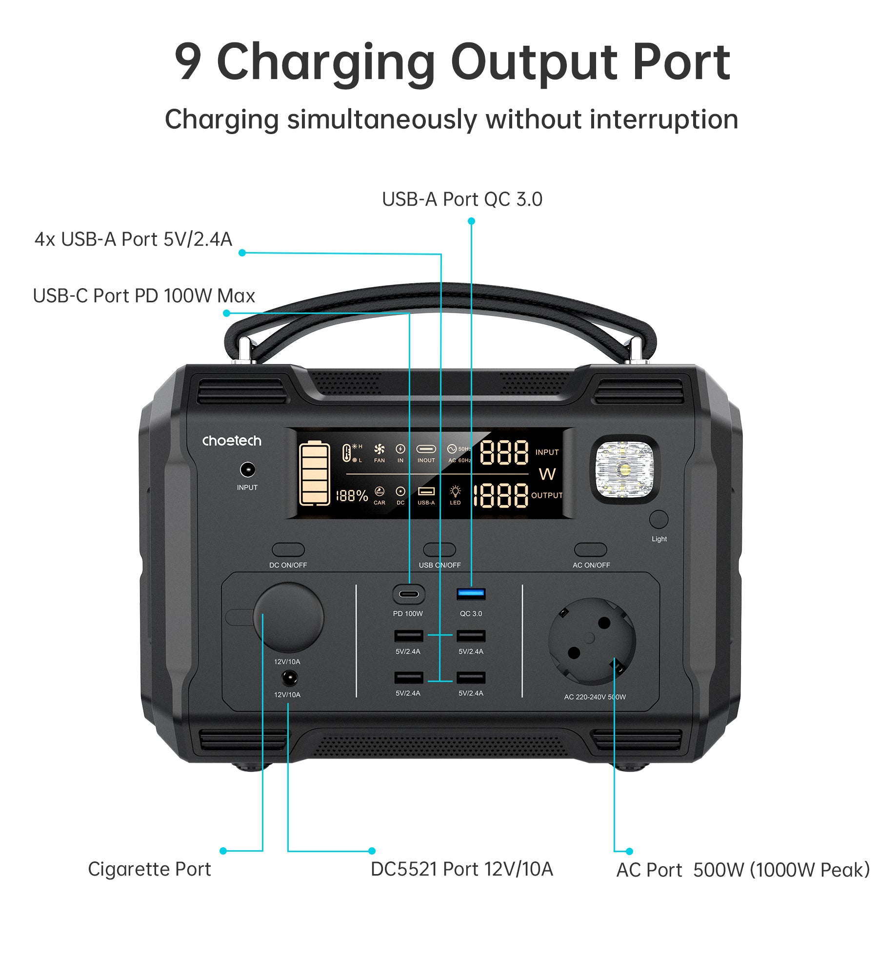 This 500W Portable Power Station is equipped with AC input/output, DC input/output, a QC3.0 USB-A port, four 5V/2.4A USB-A ports, one 100W USB-C PD port, and a cigarette lighter port. It's the most portable all-in-one power station that can meet any demand: charge your laptop, mini-cooler, drone and other outdoor electronics when you are camping.