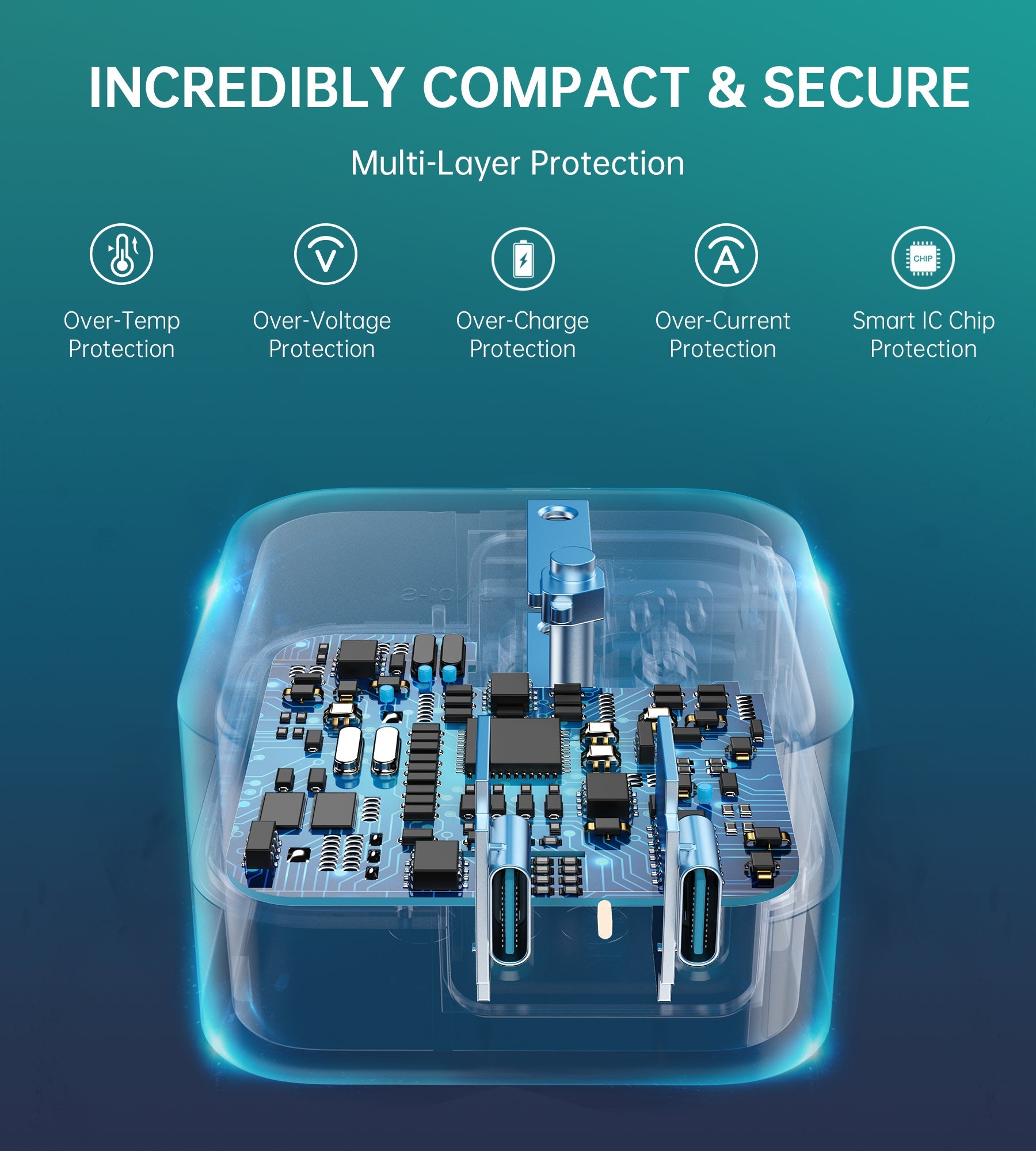 With a foldable plug and dual Type-C ports in one charging plug, it’s sleek and small enough to slip into your purse or pocket, making it ideal to travel with. With a built-in intelligent chip, our 40W Dual USB-C Wall Charger offers multiple safeguards against excessive current, overheating, overcharging etc.
