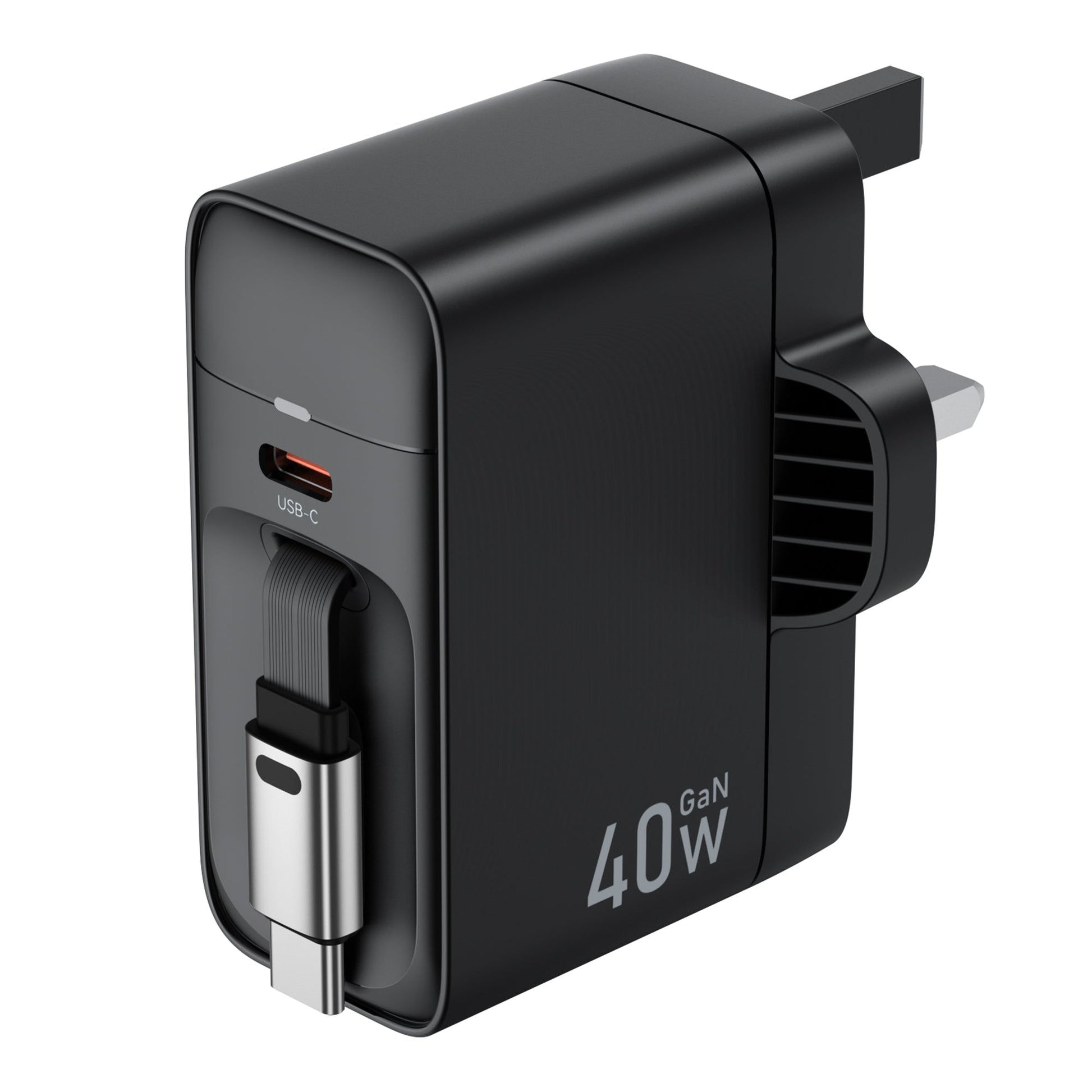 40W GaN Charger – Retractable Cable, Dual USB-C Output