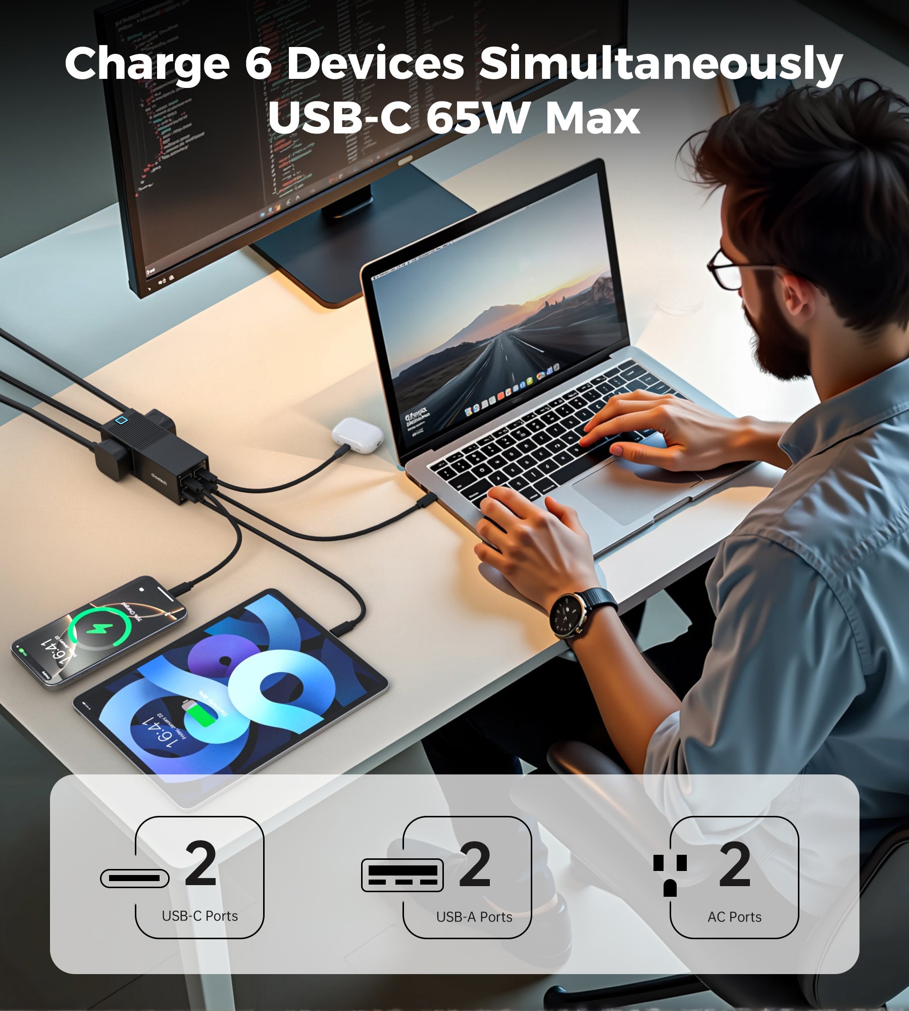 65W GaN Power Strip – USB Fast Charging Hub, Black