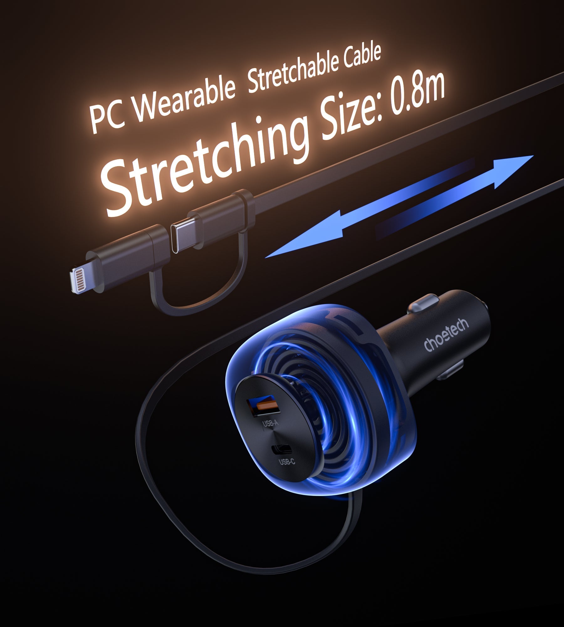 π 0.8m Retractable Cable with Dual Connector: Stretchable up to 80cm, switch seamlessly between L and USB-C β great for front and back seat use.