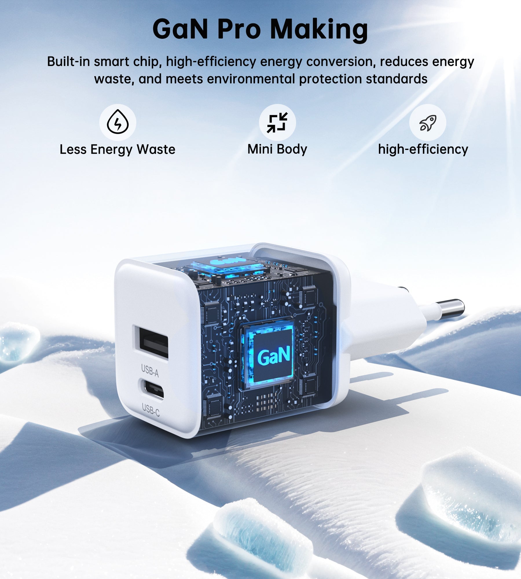 30W GaN USB-C & USB-A Charger – Dual Port, EU Plug