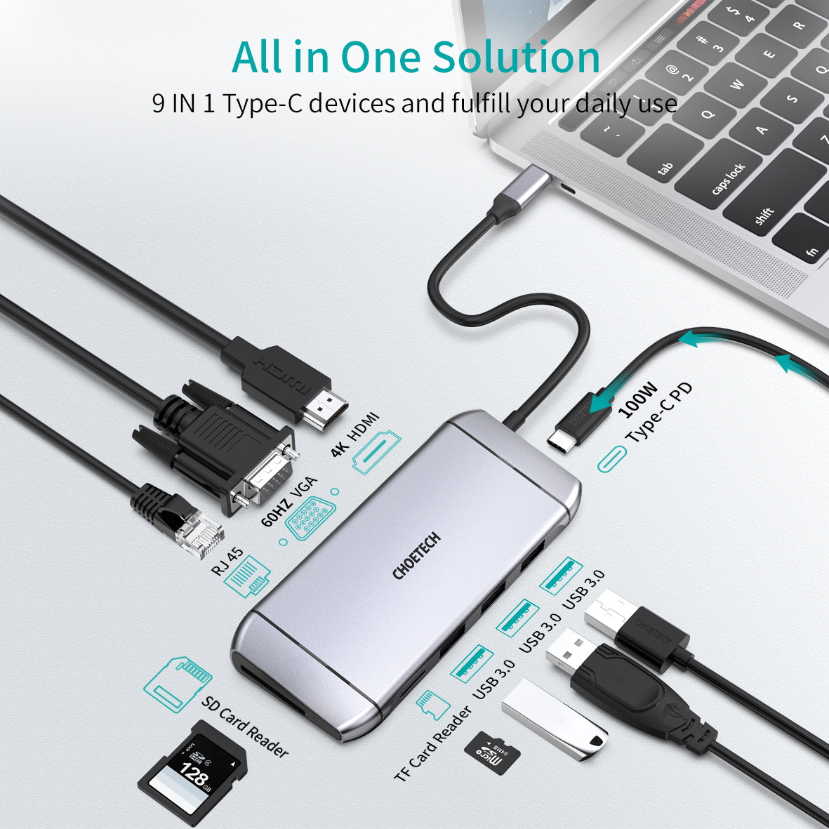 9-in-1 USB-C Hub – HDMI, VGA, PD, Ethernet, USB, for MacBook