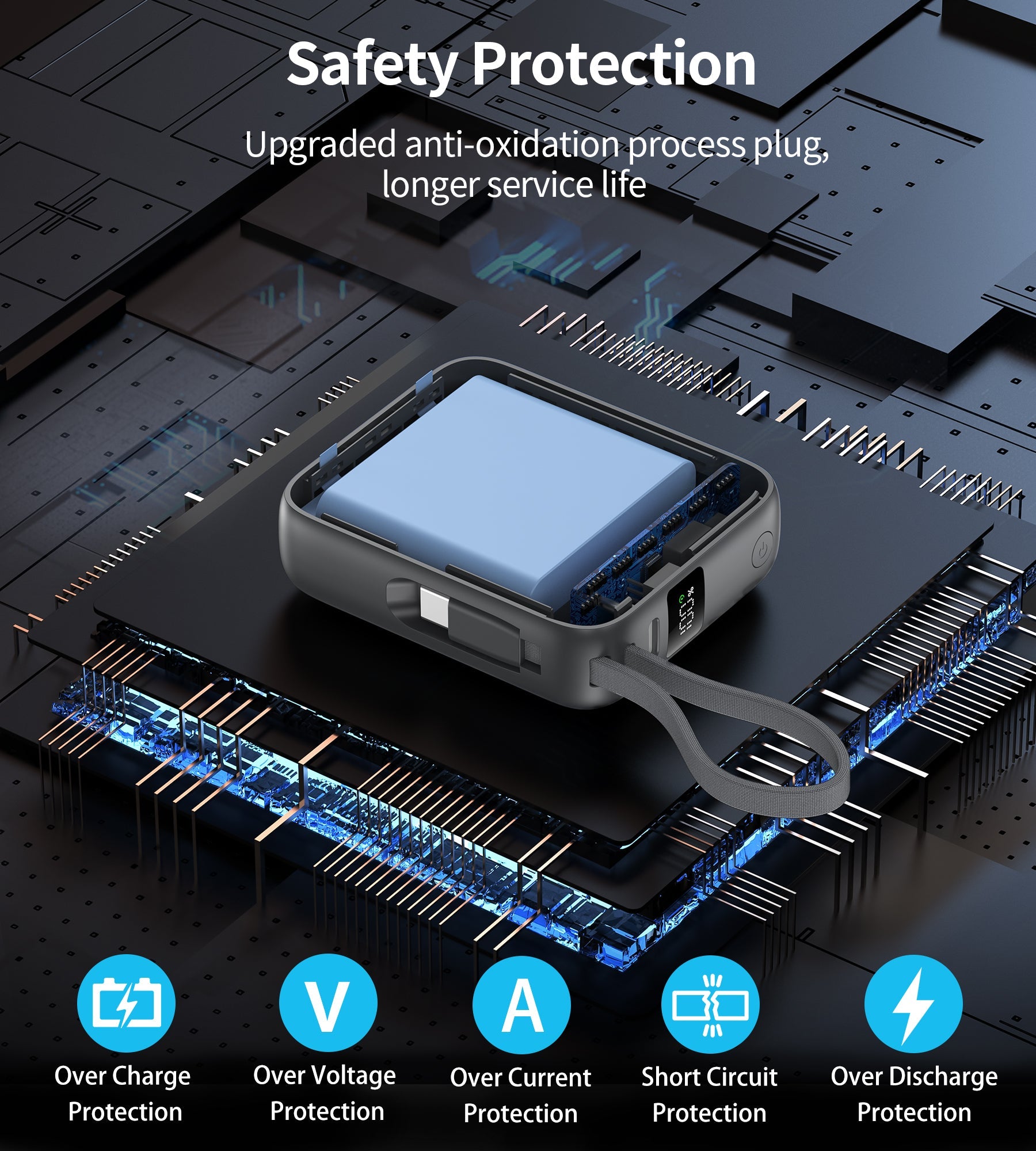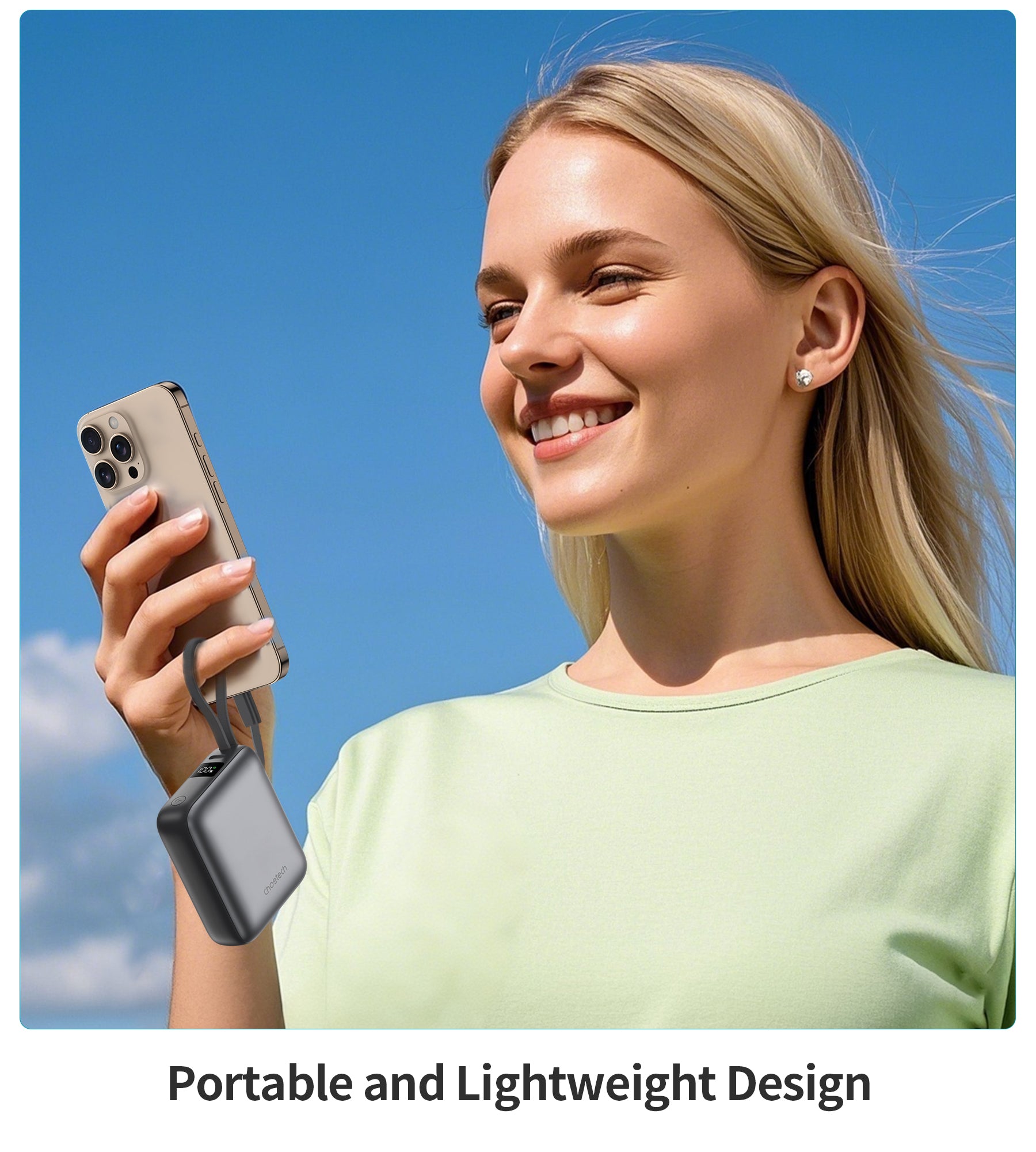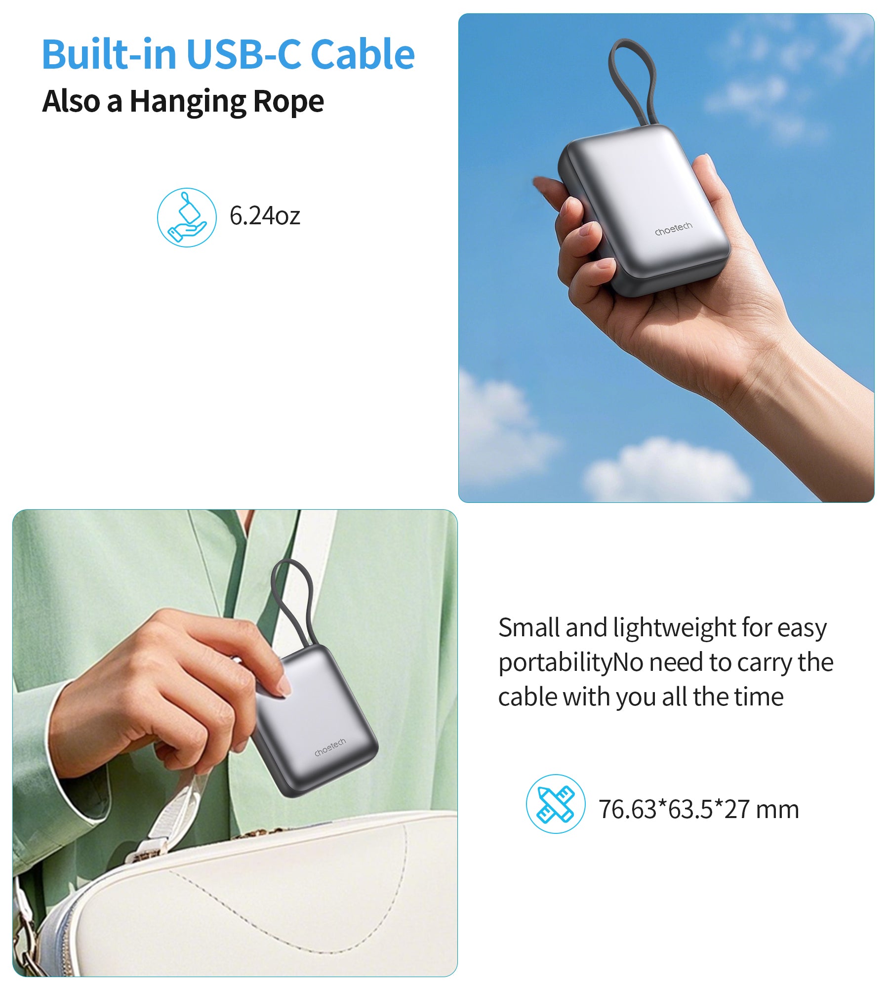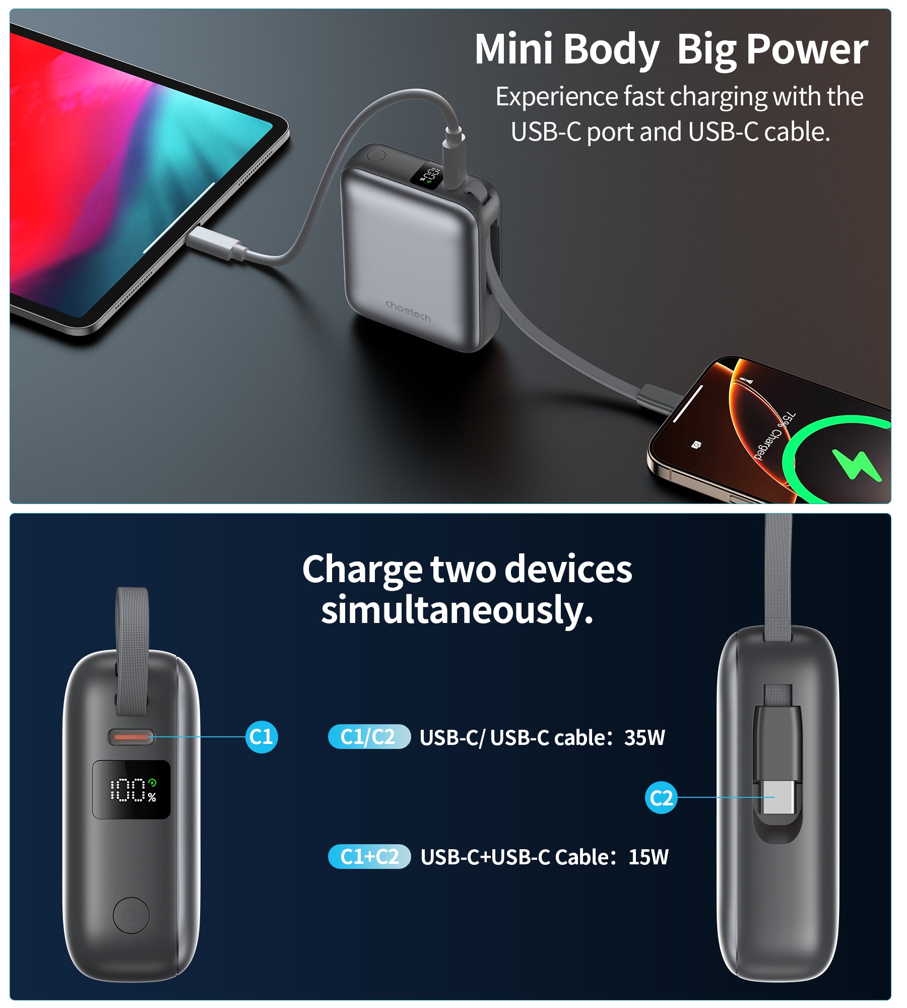 10000mAh Mini Power Bank – 35W with USB-C Cable, Grey