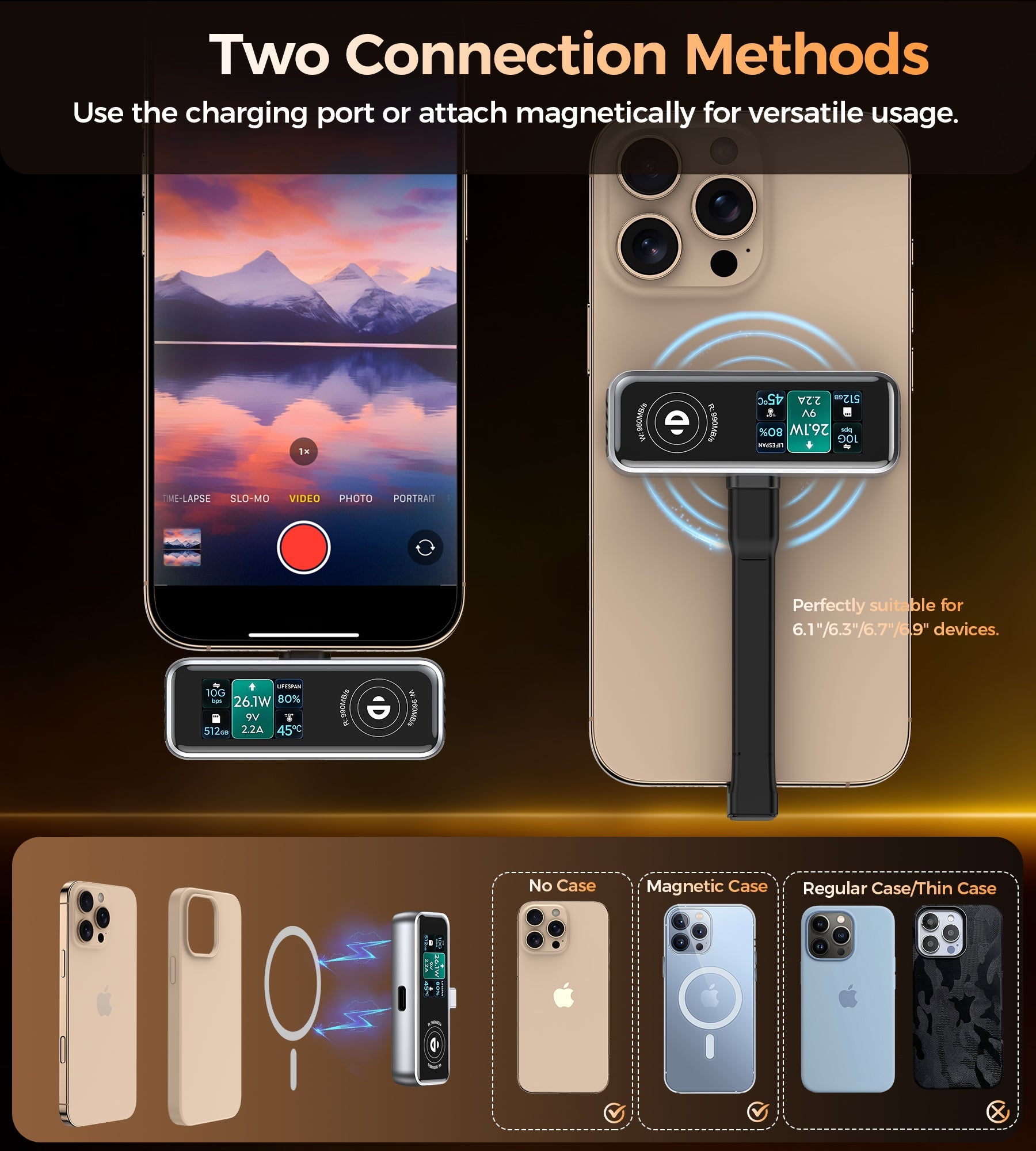 Designed with a right-angle Type-C cable, this accessory seamlessly attaches to devices of 6.1",6.3", 6.7", and 6.9" using MagSafe technology, bring you secure up to 1OGbps secure connection.