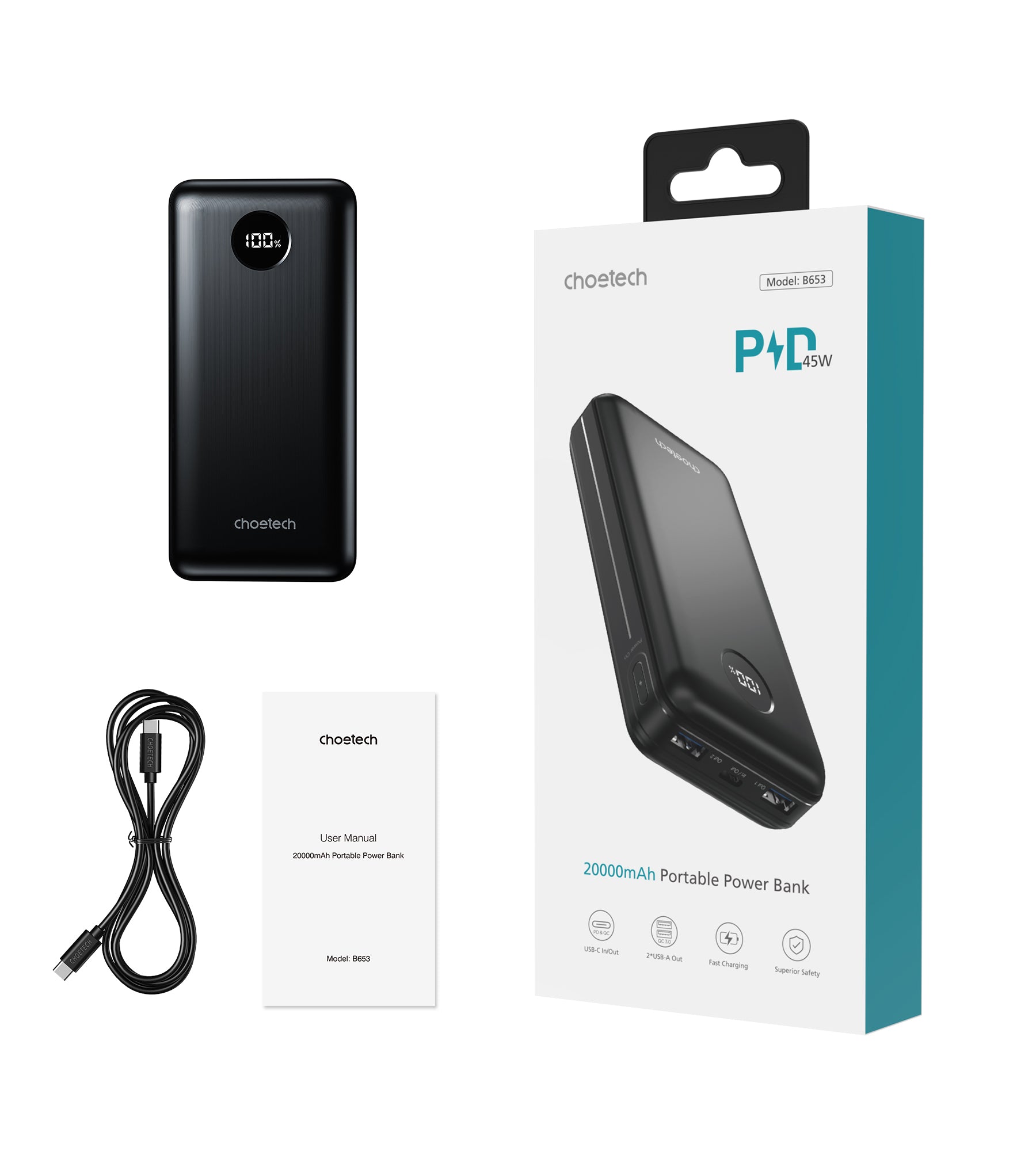 20000mAh Power Bank – 45W PD, USB‑C/A/Micro Ports, Black