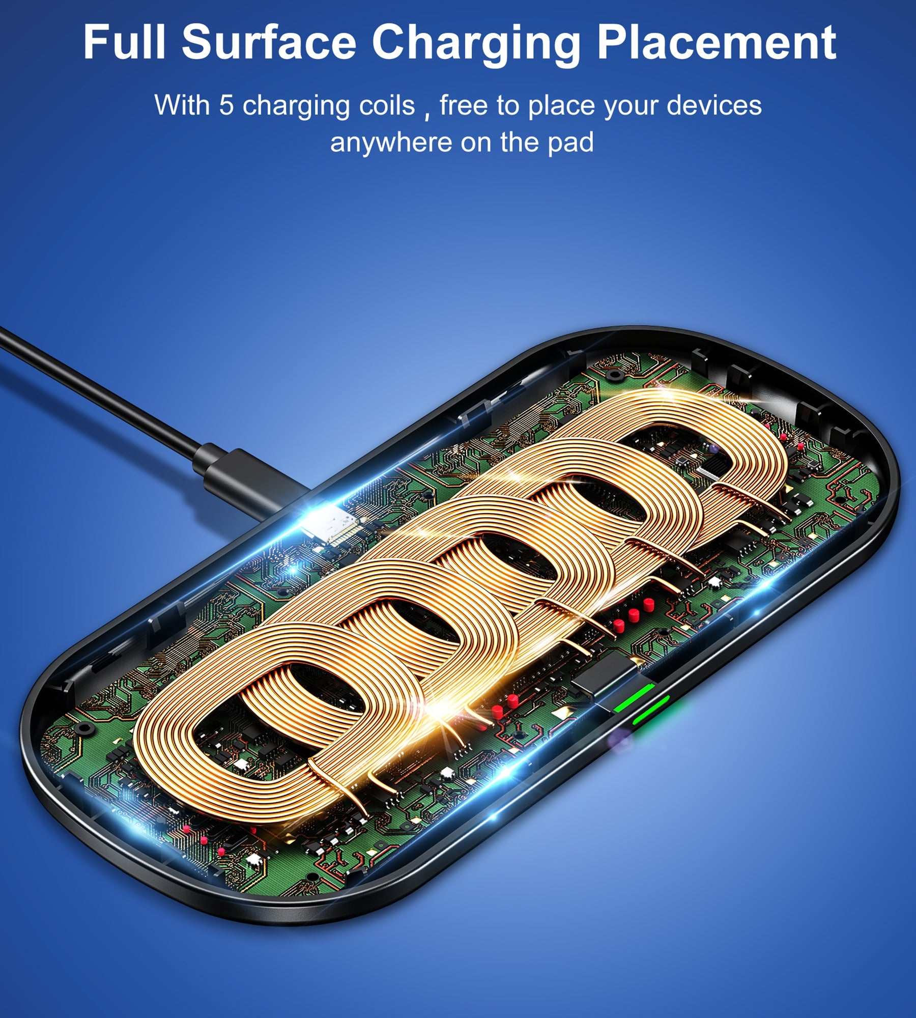 This Dual Wireless Charger shatters through the technical difficulties of the wireless industry, take the lead in upgrading to 5 coils. Wireless charging pad Built-in 5 coils provide a wider charging area to boost charging efficiency, just place your phone on the non-slip charging surface with a free position, enjoy fast wireless charging.