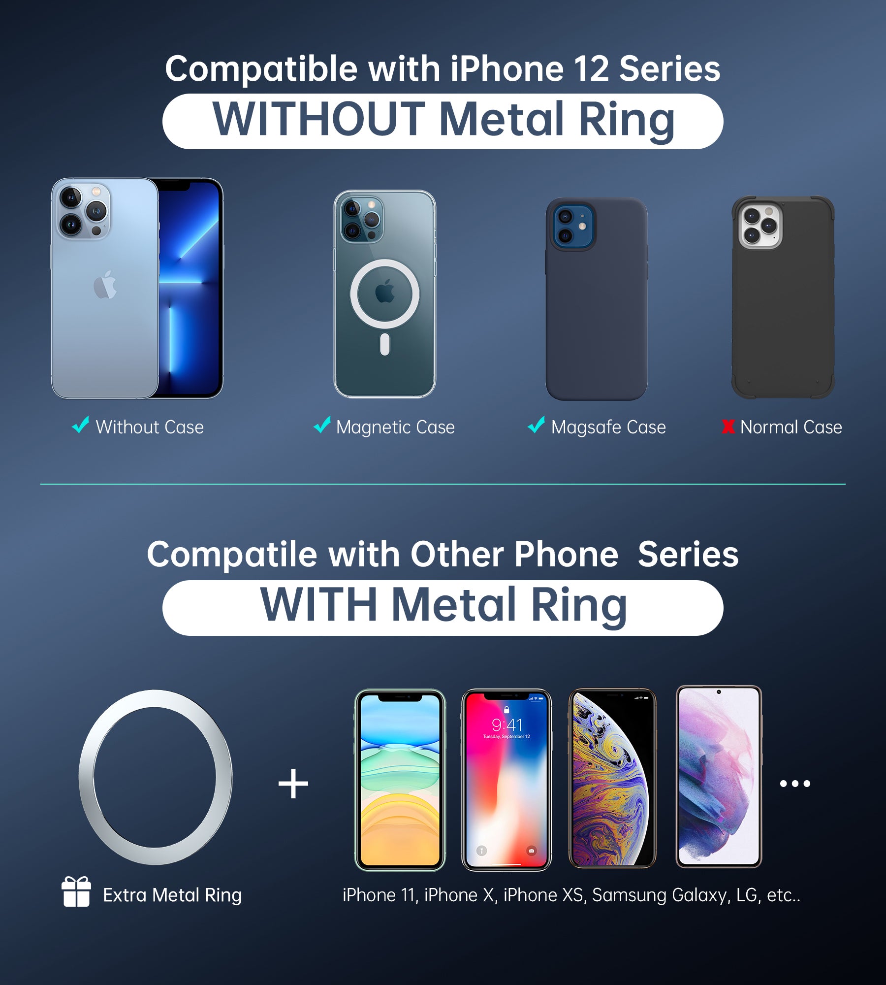 Compatible with almost all phones - just attach an extra metal ring to the back of your non-magsafe phone or case, then you can use our Magnetic Car Mount. Case-friendly design will make your life so much easier - no need to take off the protective case every time you want to mount your phone.