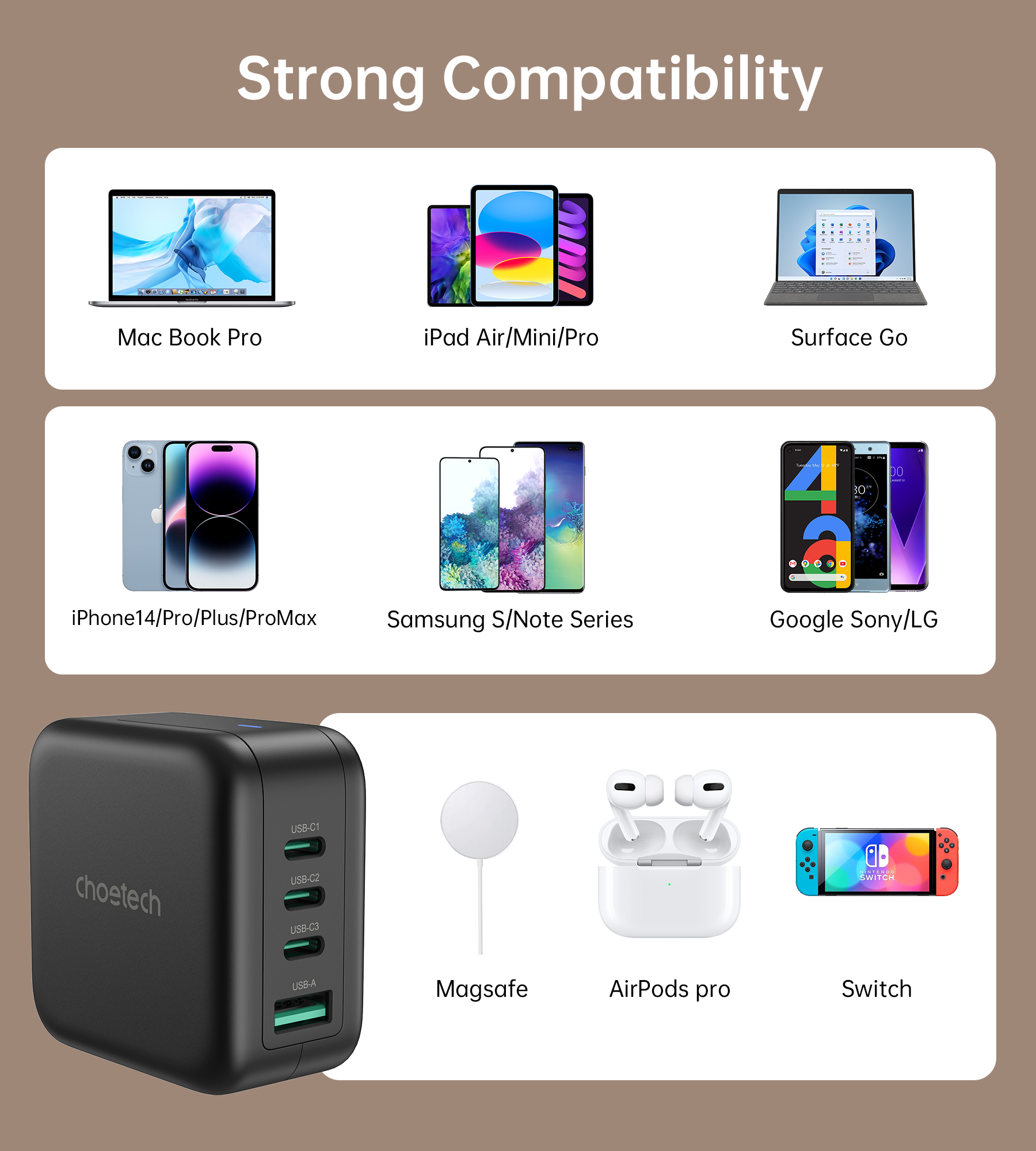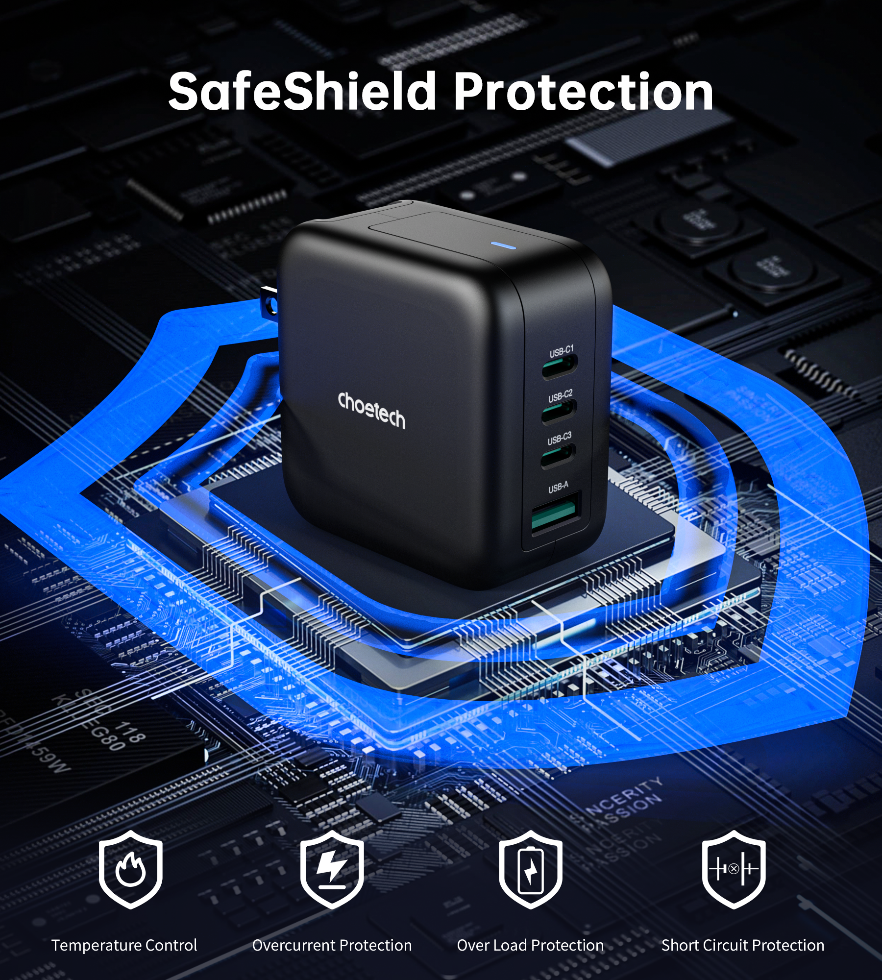 Model PD6055 Material Anti-fire ABS + PC Interface Anti-fire ABS + PC Input: 100-240V;50/60Hz AC Output:USB-C1 PD70W(5V3A/9V3A/12V3A/15V3A/20V3.5A) USB-C2/3 PD20W(5V3A/9V2.22A/12V1.67A) USB-A QC18W(5V3A/9V2A/12V1.5A) USB-C1+C2/C3/A:PD45W+PD20W/PD20W/QC18W USB-(C2+C3)/(C2+A)/(C3+A):5V 3.6A USB-C1+(C2+C3)/(C2+A)/(C3+A):PD45W+5V 3.6A USB-C2+C3+A:5V 3.6A USB-C1+(C2+C3+A):PD45W+5V 3.6A Power: 70W Plug: US/JP/EU/UK/AU Weight: 204g(US) Dimension: 62.5*61.5*33mm Protocol PD3.1, QC3.0, Apple-2.4A Certifications TUV, CE, FCC, ROHS, PSE, DOC IV, ETL