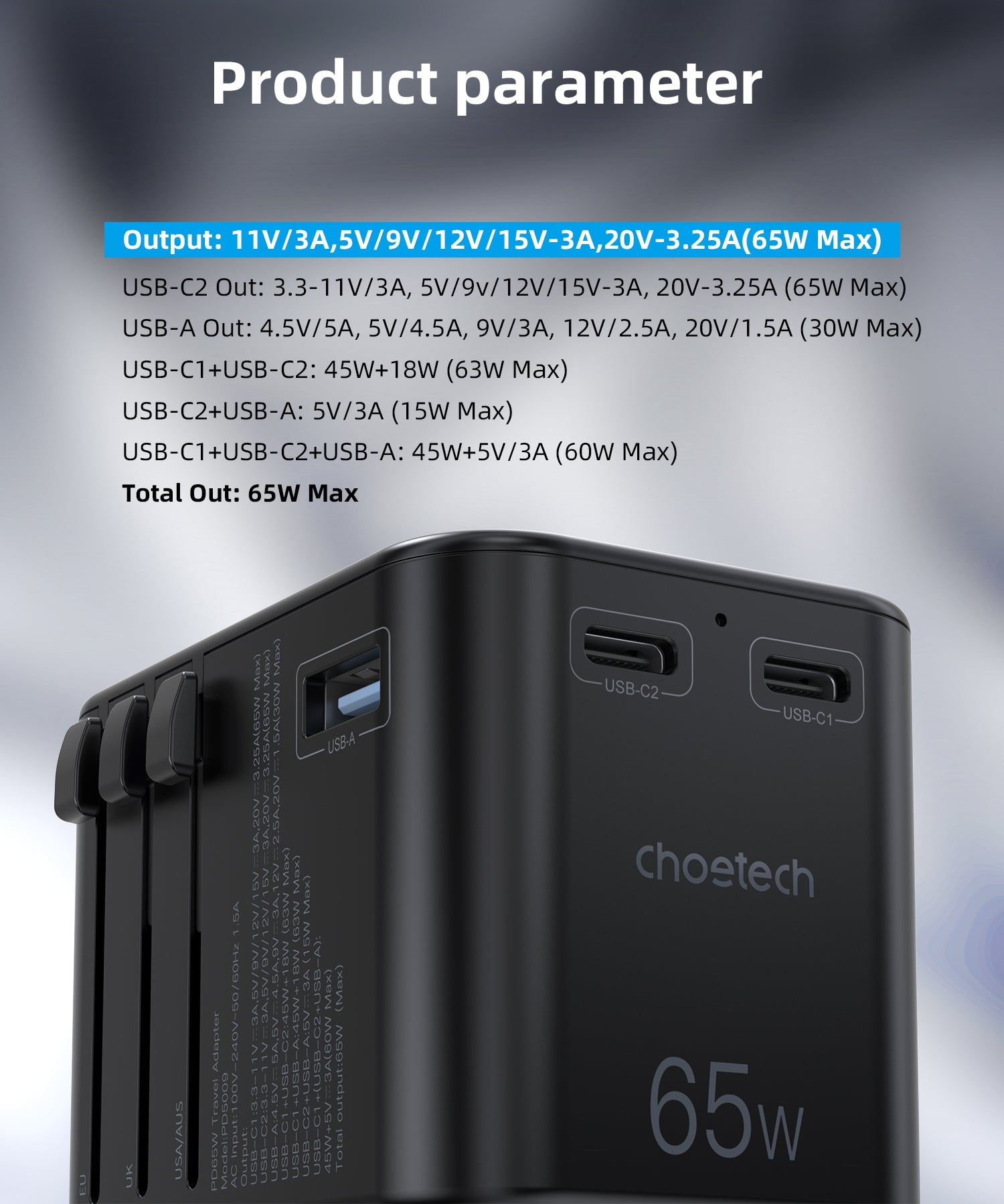 Features: 1. US, UK, EU and AU plugs to ensure that you can use this travel adapter nearly anywhere. 2. A 65W Power Delivery USB-C port and two other ports to ensure simultaneous charging of multiple devices. 3. Easy to use with slides to take out the plugs depending on which country you are currently traveling to.