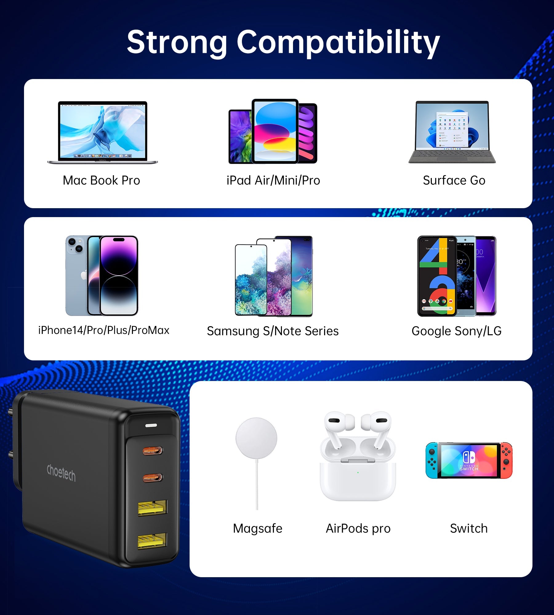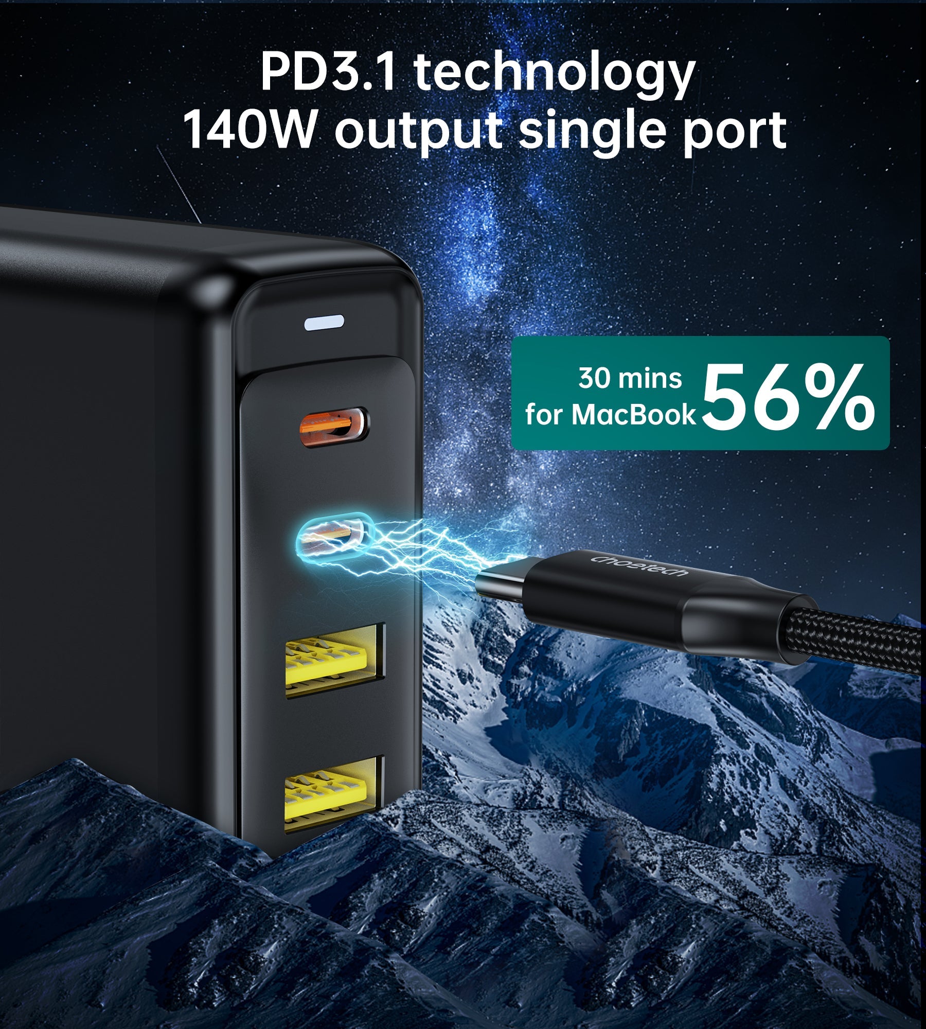 140W GaN Wall Charger – Dual USB-C + Dual USB-A Output