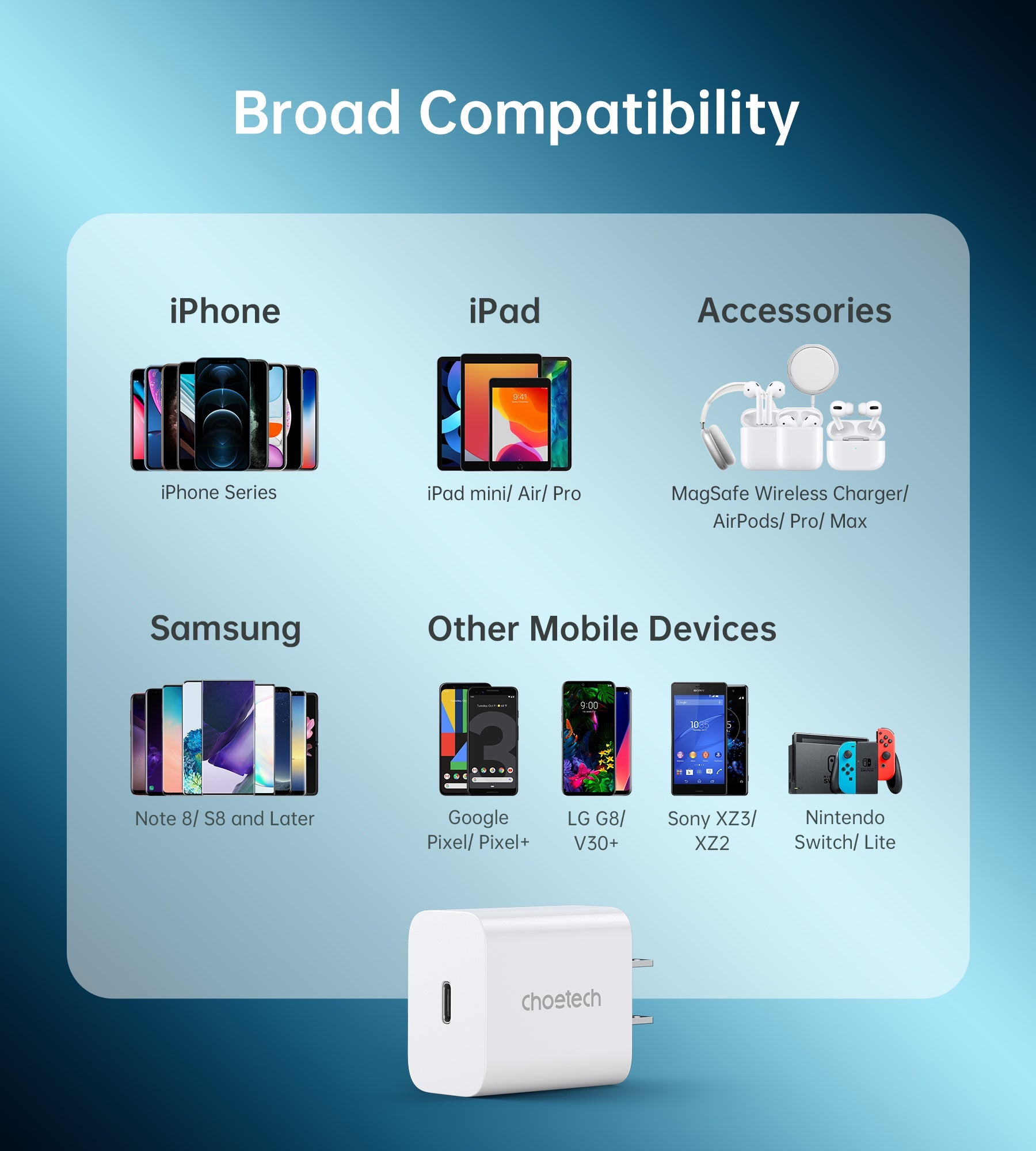 The fast charging iPhone charger Works perfectly to charge all kinds of USB-C mobile devices and tablets.