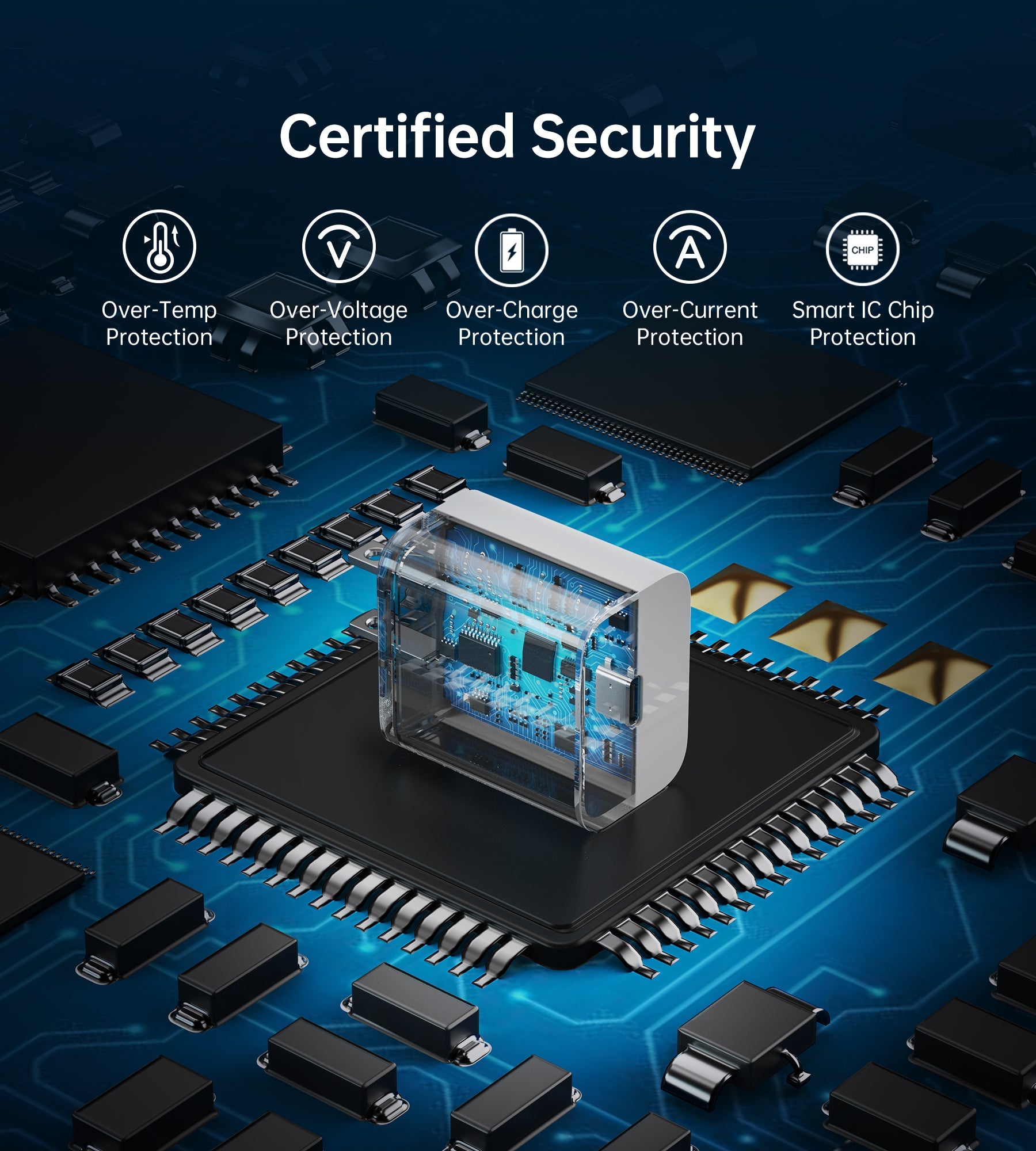 Built-in intelligent chip, this Type C fast charger provides protection against over-current, over-voltage, over-heat and short-circuit and ensures safe charging for your devices.